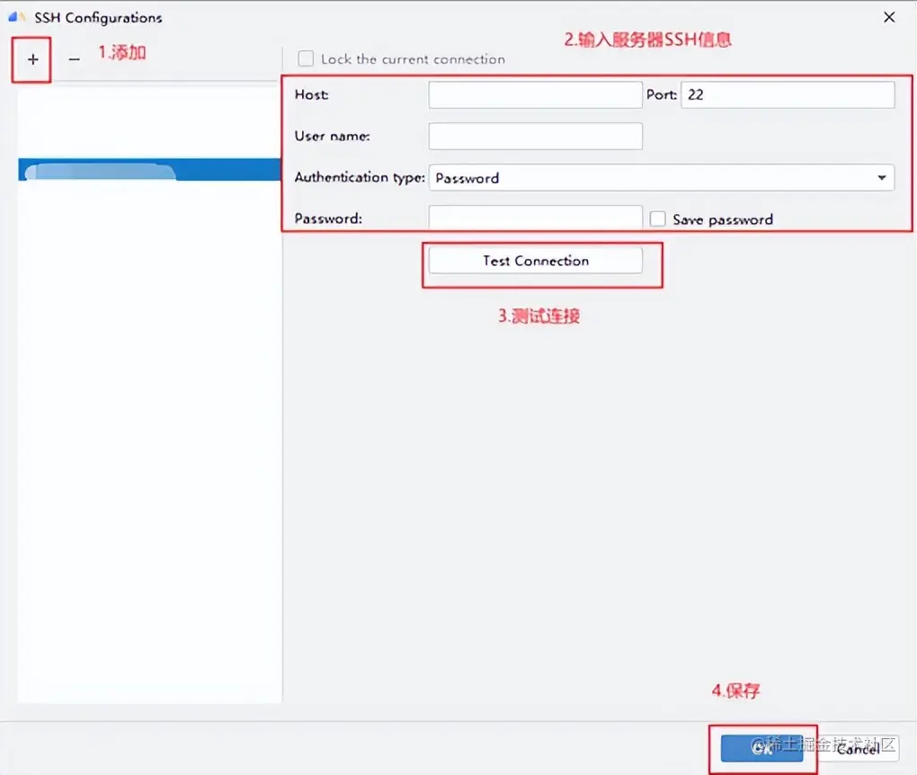 点击右侧 + 进行配置远程服务器,如下图所示: