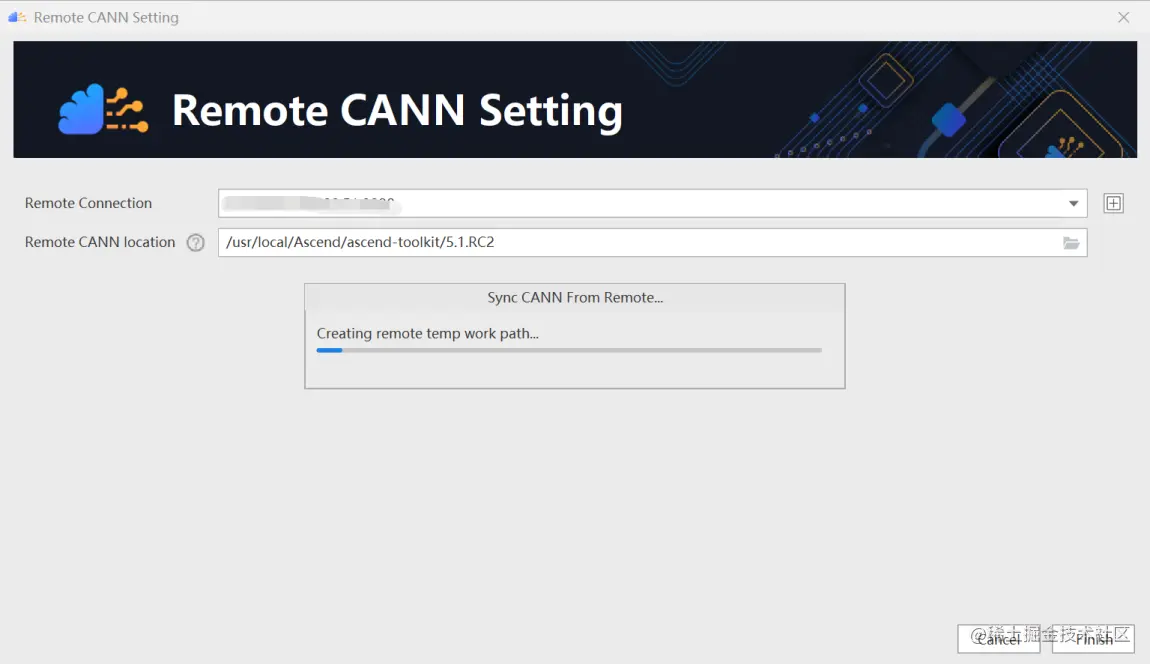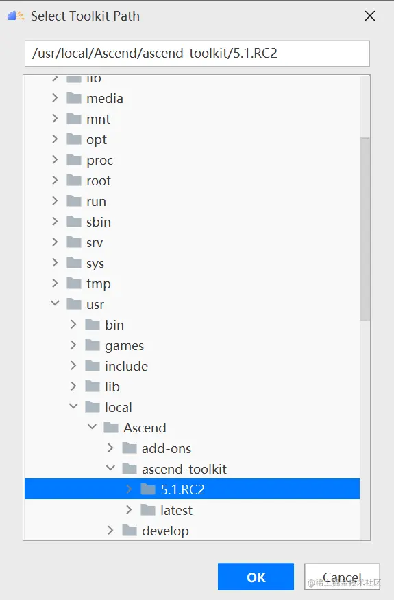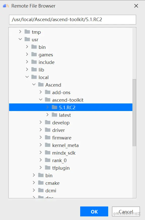 在Remote CANN location中选择CANN的路径,需要注意的是必须选择到CANN的版本号目录,这里选择的是5.1.RC2版本,如下图所示: