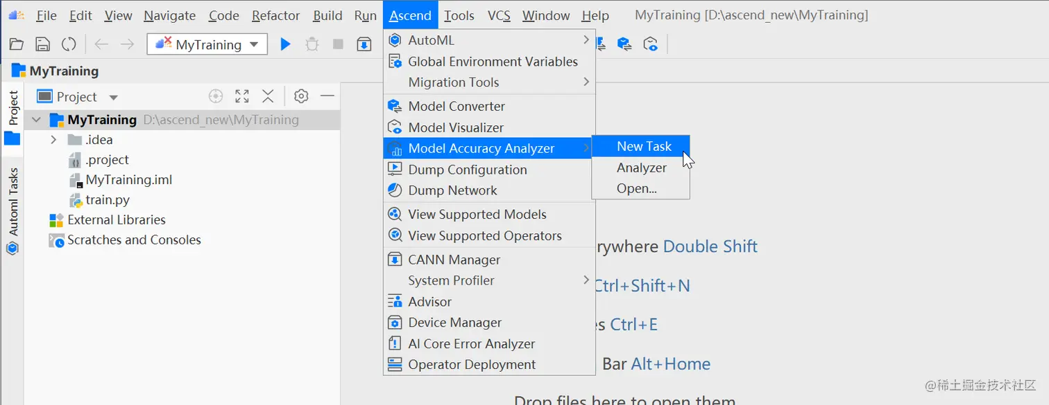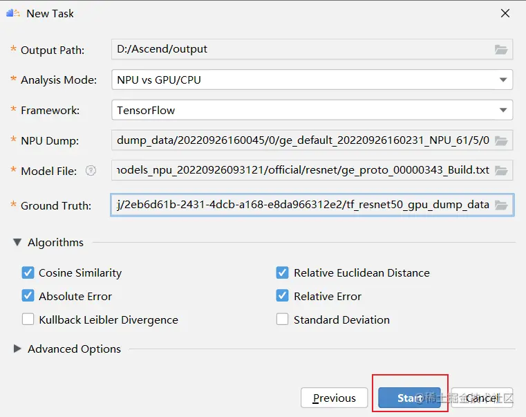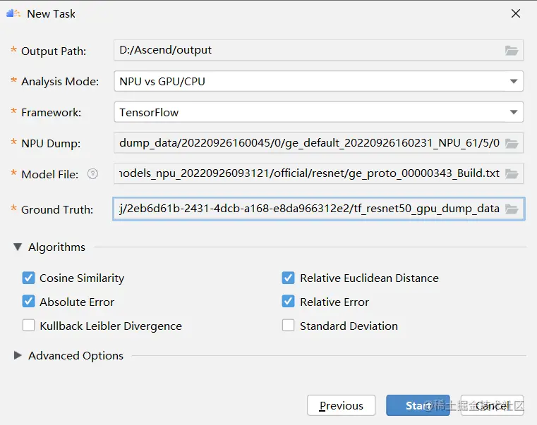 在MindStudio菜单栏选择“Ascend > Model Accuracy Analyzer > New Task”,进入精度比对参数配置界面。