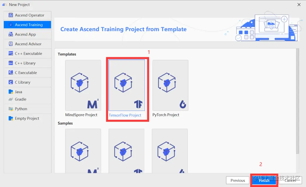 在训练工程选择界面,选择“TensorFlow Project”,单击“Finish”。