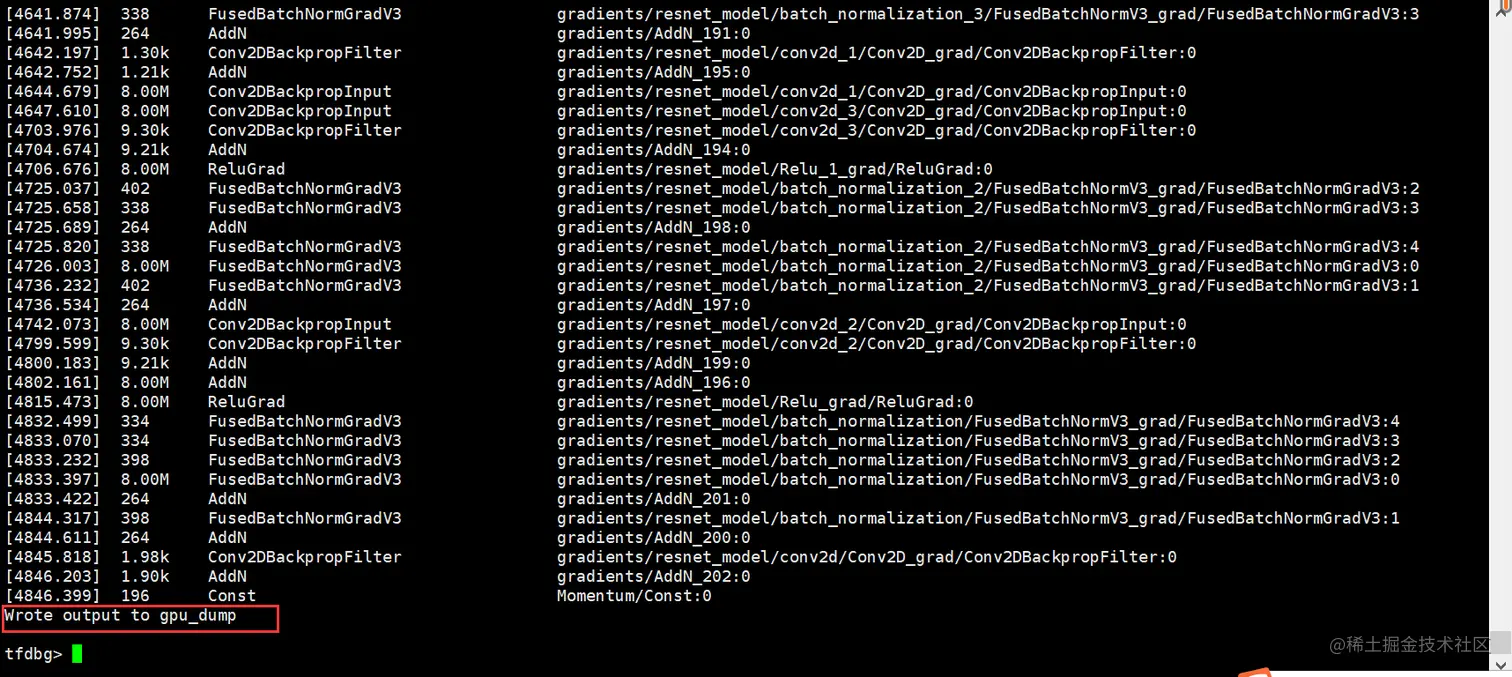 执行lt>gpu_dump命令将所有tensor的名称暂存到自定义名称的gpu_dump文件里。命令行中会有如下回显。