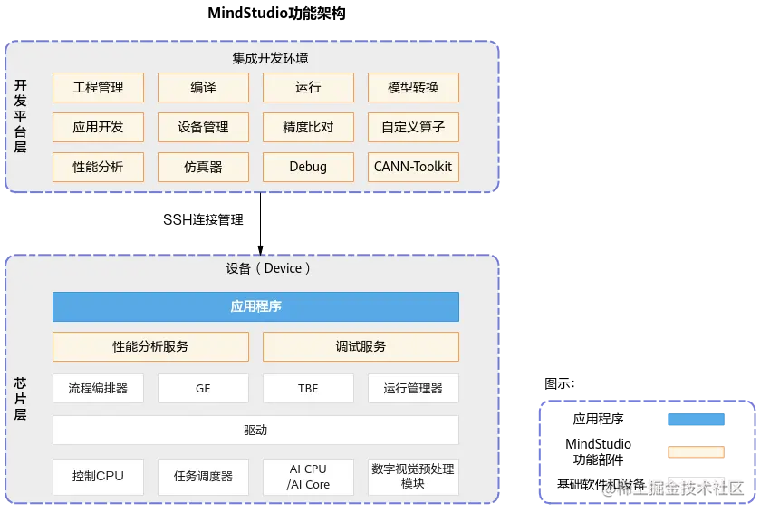 - 开发工具包的安装与管理:为开发者提供基于昇腾AI处理器的相关算法开发套件包Ascend-cann-toolkit,旨在帮助开发者进行快速、高效的人工智能算法开发。开发者可以将开发套件包安装到MindStudio上,使用MindStudio进行快速开发。Ascend-cann-toolkit包含了基于昇腾AI处理器开发依赖的头文件和库文件、编译工具链、调优工具等。