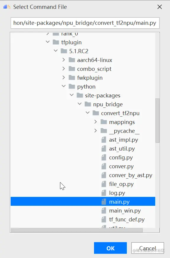 根据tfplugin文件所在路径选择/Ascend/tfplugin/5.1.RC2/python/site-packages/npu_bridge/convert_tf2npu/main.py,如下图所示