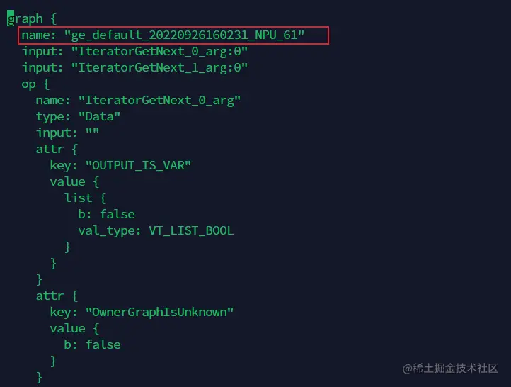 打开上面找到的计算图文件,记录下第一个graph中的name字段值。如下示例中,记录下“ge_default_20220926160231_NPU_61”。
