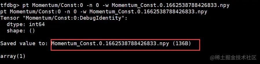 将上一步生成的dump.txt文件中所有tensor存储的命令复制(所有以“pt”开头的命令),然后回到tfdbg命令行(刚才执行训练脚本的控制台)粘贴执行,即可存储所有的npy文件,存储路径为训练脚本所在目录。