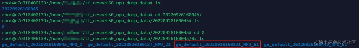 进入以时间戳命名的dump文件存放路径下,找到刚记录的名称为name值的文件夹,例如ge_default_20220926160231_NPU_61,则下图目录下的文件即为需要的dump数据文件: