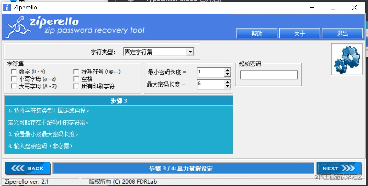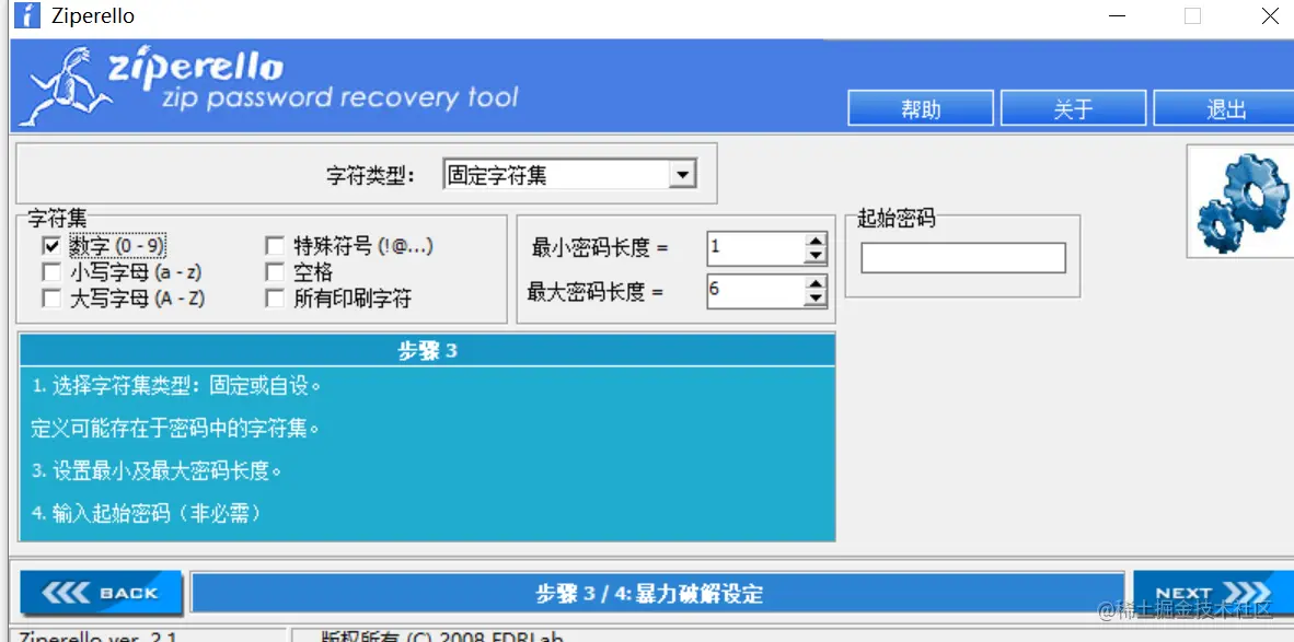 我们这里只是做个例子,所以已知密码1234,我们选择字符集数字就行: