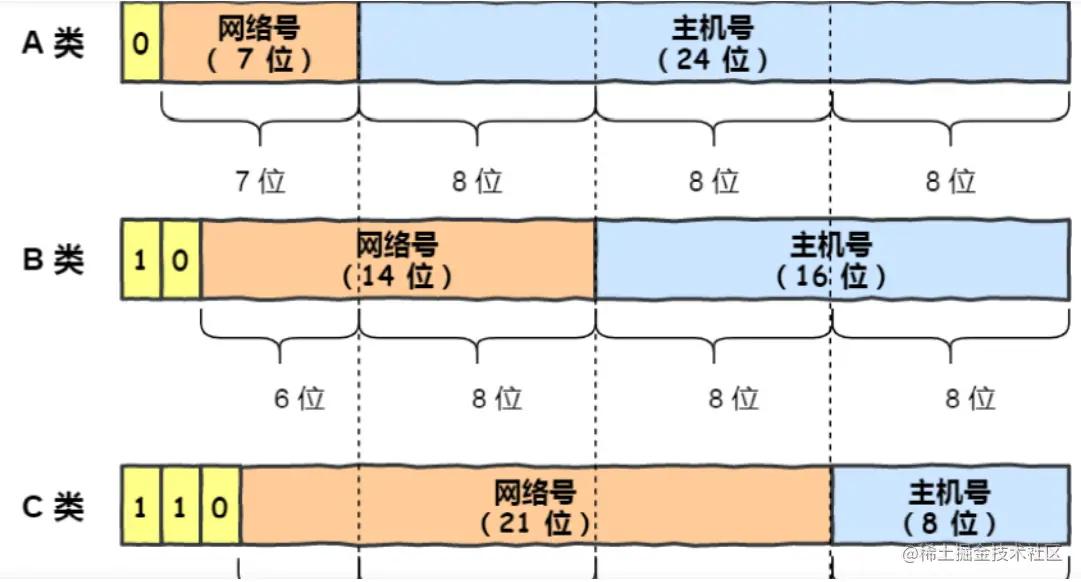 我们这里只讲IPv4,他是由32位二进制数组成,就像这样:00000000 00000000 00000000 00000000;例如一个IP地址是:192.168.1.1,他的二进制形式就是11000000.10101000.0000001.00000001。当然从这里可以看到,IPv4只支持2的32次方个网络设备同时接入,于是出现了IPv6,把32位改成了128位,这样可以支持更多的网络设备。IP地址为了方便管理,又划分了好几个类型,其中ABC类网直接用于为各局域网的网络设备分配地址,其他类型想要了解课自行学习了解。ABC类型如下图:
