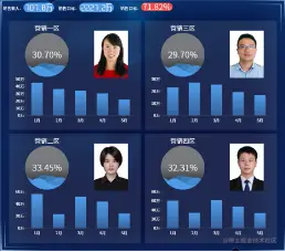 展示销售人员的业绩完成情况,照片和每个月的销售额。这也是一个典型的应用场景,每个销售人员展示的信息完全相同,并且在展示时增加了一些图表图片,丰富了数据的展示形式;