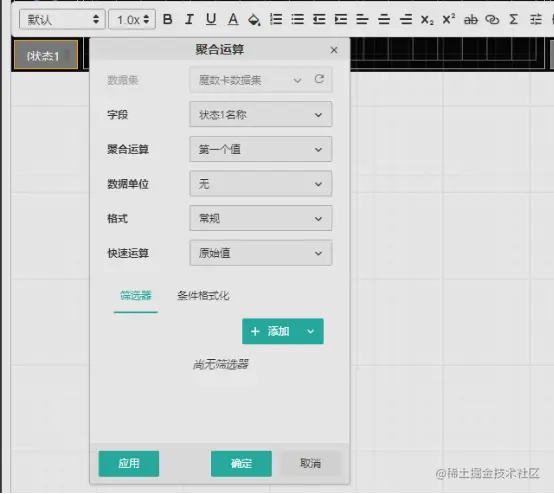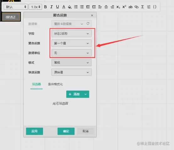 我们在图表中添加一个“富文本”组件,然后在“插入表达式中”进行下图中的设计:选中我们要展示的字段,然后选择运算方式为“第一个值”(我们这里只做数据的展示,不做其他的任何运算)。然后重复这个操作将我们要展示的数据全部添加上: