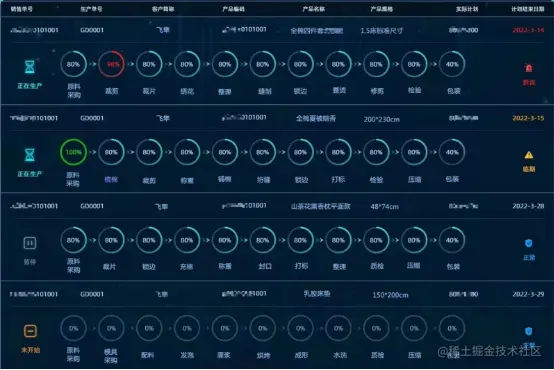 在设计之前,我们需要先确定我们的使用场景是否适合我们的魔术卡,使用魔术卡。然后确定我们要展示的数据,并进行布局设计。我们以上面的工厂订单工序追踪为例,介绍魔数图的使用设计全过程(不包括最后的背景样式调整)。