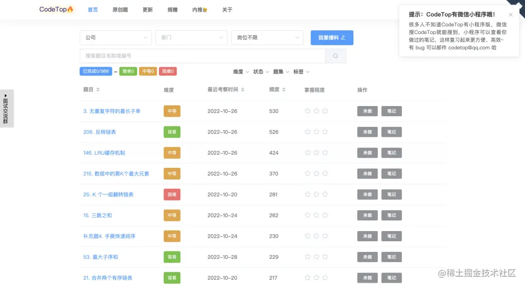 CodeTop 上汇总了各大互联网公司容易考察的高频 leetcode 题,支持按照公司、部门、岗位组合查询。