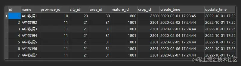 B 表字段:name, province_id, city_id, area_id, mature_id, crop_id, create_time, update_time