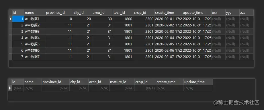 A 表字段:name, province_id, city_id, area_id, tech_id, crop_id, field_id, create_time, update_time, xxx, yyy, zzz, ...
