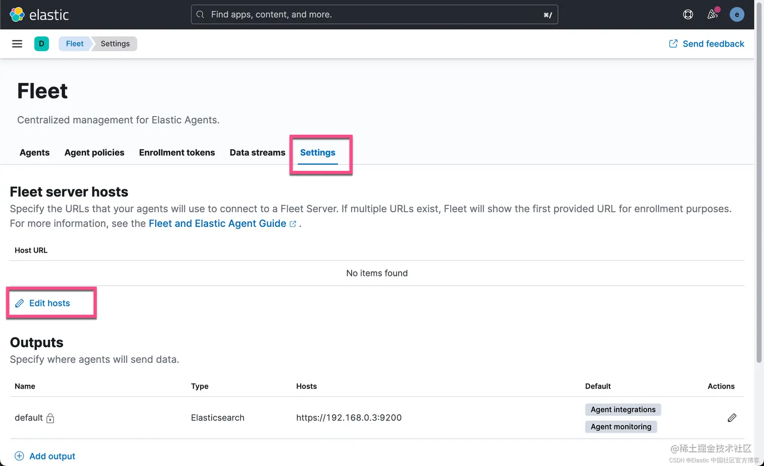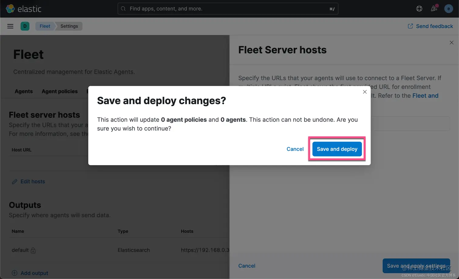 在上面,我们配置 Fleet Server 到 Ubuntu OS 机器上。它具有 https 的访问。点击上面的 Save and apply settings。