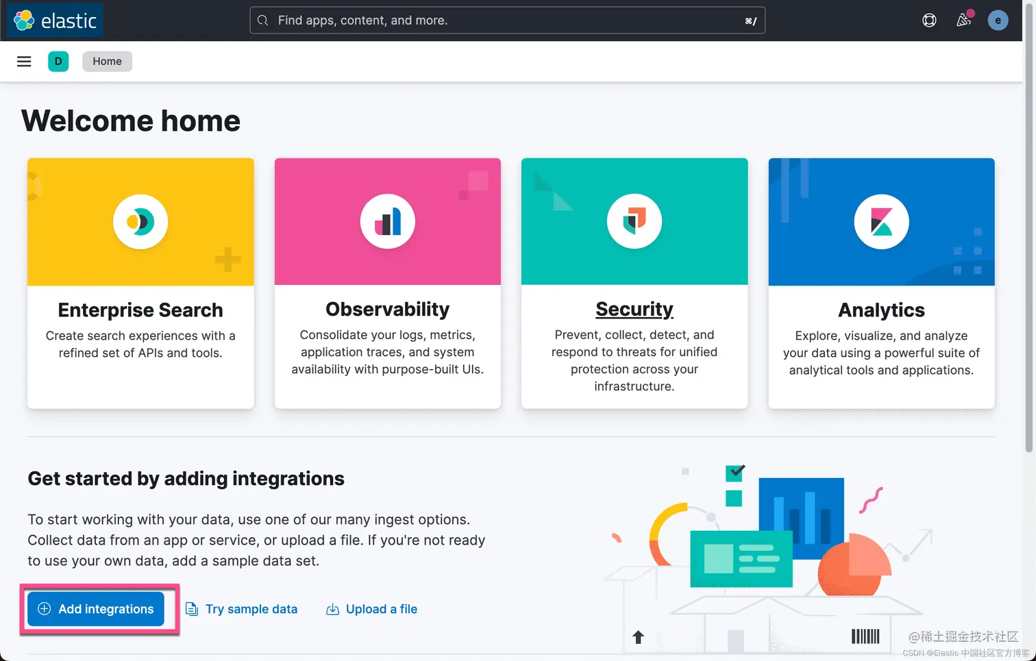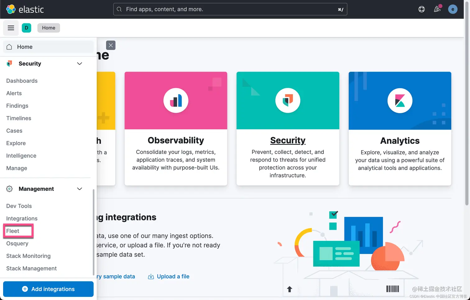 使用 Kibana 中的 Fleet 将日志、指标和安全数据导入 Elastic Stack。第一次使用 Fleet 时,你可能需要对其进行设置并添加 Fleet Server。在做配置之前,我们首先来查看一下有没有任何的 integration 被安装: