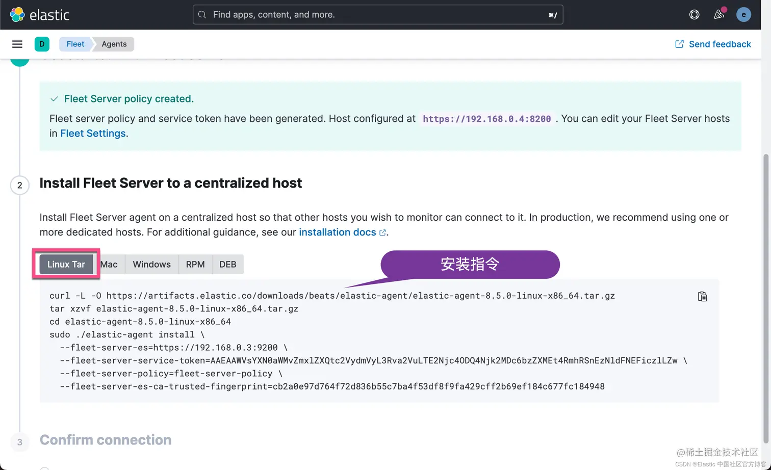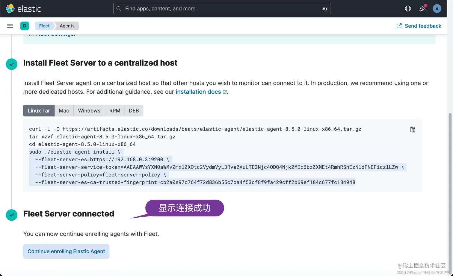 如果我们想在其它的机器上继续安装 Elastic Agent,那么请点击上面的 Continue enrolling Elastic Agent。