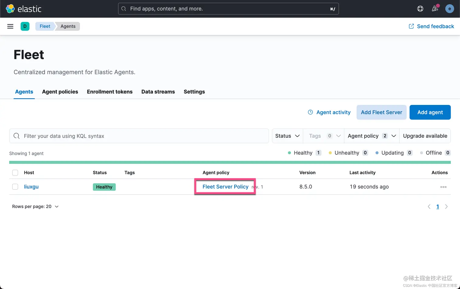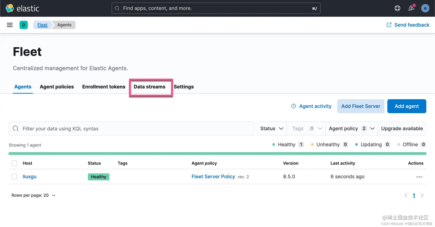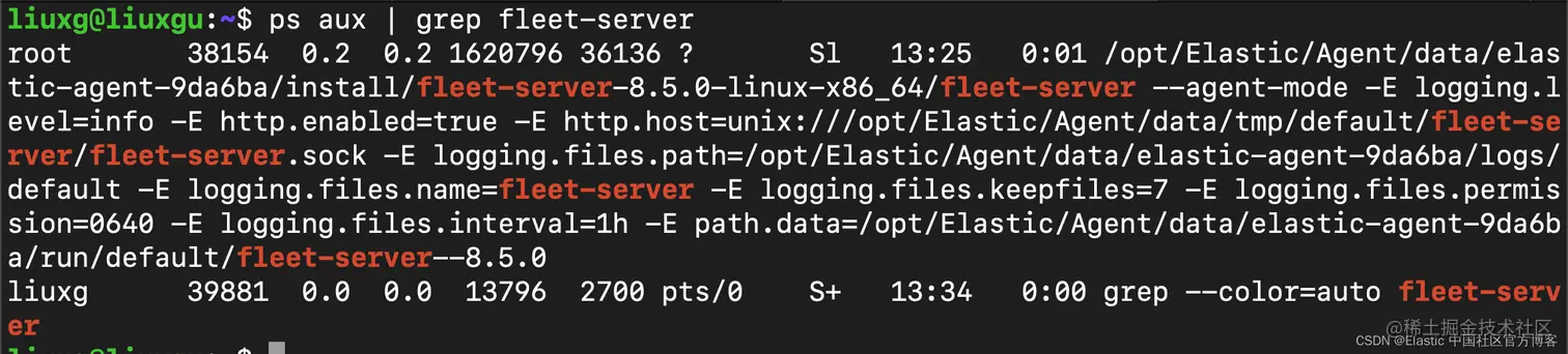 从上面的输出中,我们可以看出来我们的 Fleet Server 已经被成功地安装,并且 Elastic Agent 在 Ubuntu 机器上也已经运行起来了。