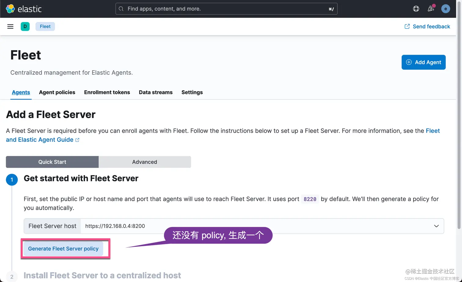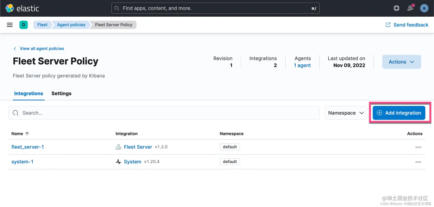 由于我们的 Elastic Agent 和 Fleet Server 是在一个服务器上运行的,所以,我们直接在 Fleet Server Policy 里添加我们想要的 integration。如果你的 Elastic Agent 可以运行于另外的一个机器上,而不和 Fleet Server 在同一个机器上,你可以创建一个新的 policy,比如 logs。然后让 agent 赋予给这个 新创建的 policy。我们需要明白的一点是在我们上面安装 Elastic Agent 的时候,它同时也安装了 Fleet Server。在一个机器上,我们只能运行一个 Elastic Agent 的实例。