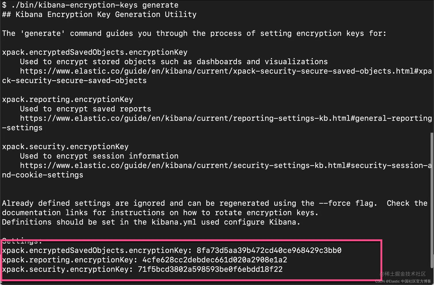 从上面的输出中,我们可以看出来,有三个输出的 key。我们可以把这三个同时拷贝,并添加到 config/kibana.yml 文件的后面。当然,我们也可以只拷贝其中的一个也可。我们再重新启动 Kibana。