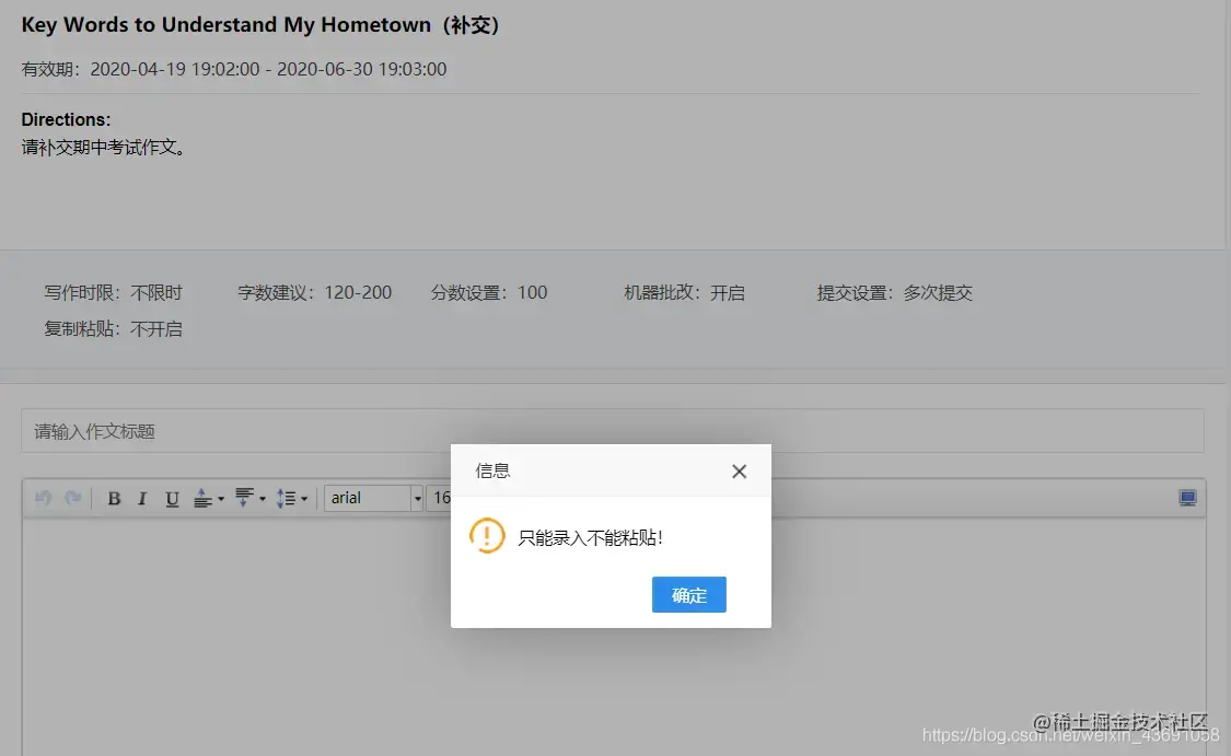 以iwrite英语教学平台为例,先来补一补之前落下的英语作文。刚点到输入框,就弹出来了禁止粘贴的消息框,emmm,这都大学了,师生之间连这点基本的信任都没有吗?