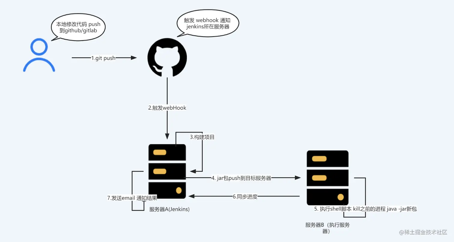 如果代码频繁改动就要一直重复以上流程,有什么方案能免去这繁琐的步骤呢 没错! 我们可以使用Jenkins自动帮我们完成以上步骤