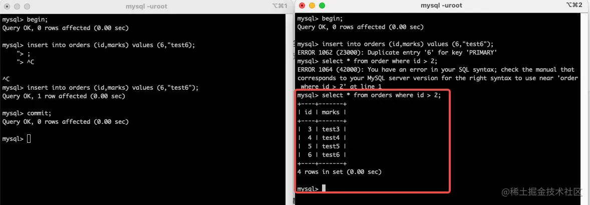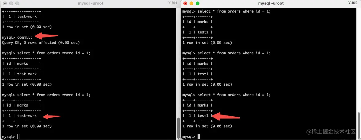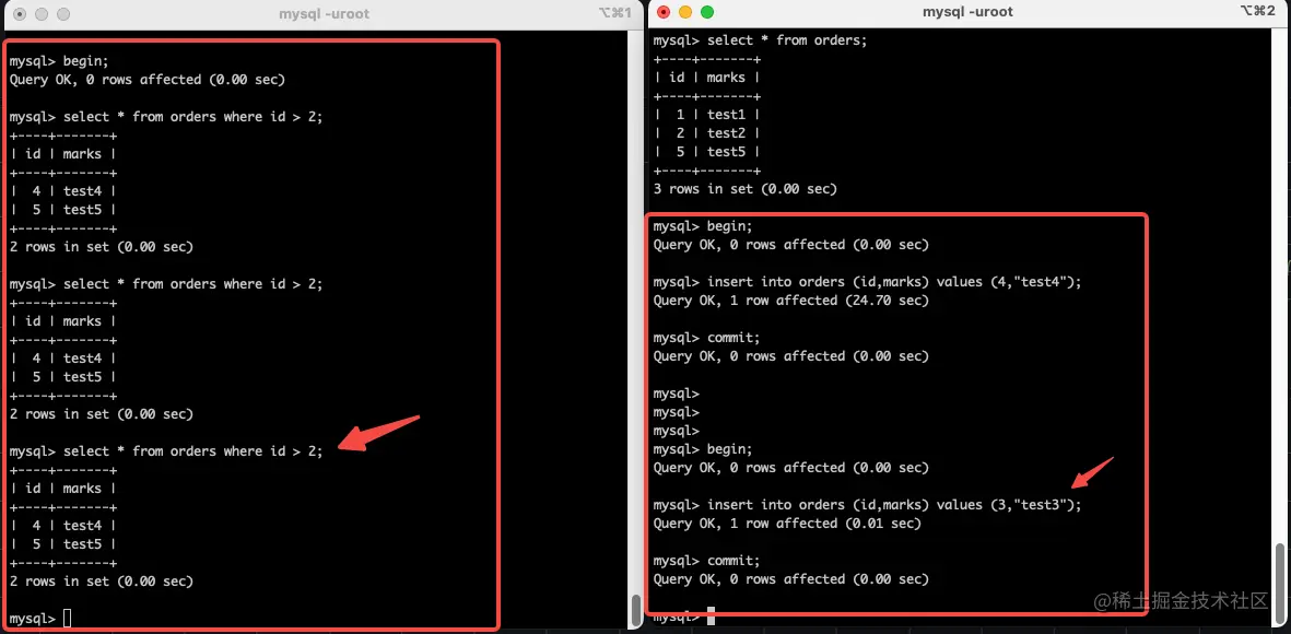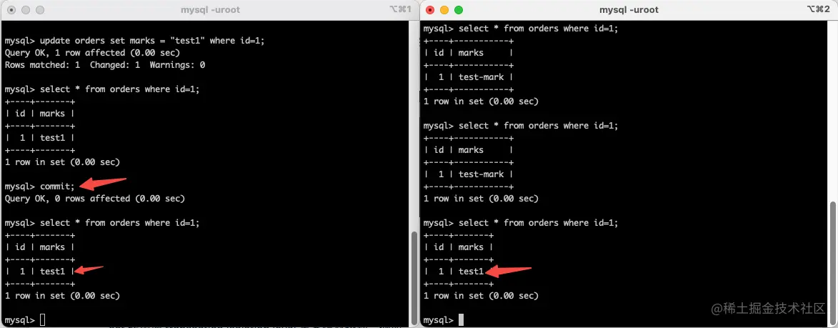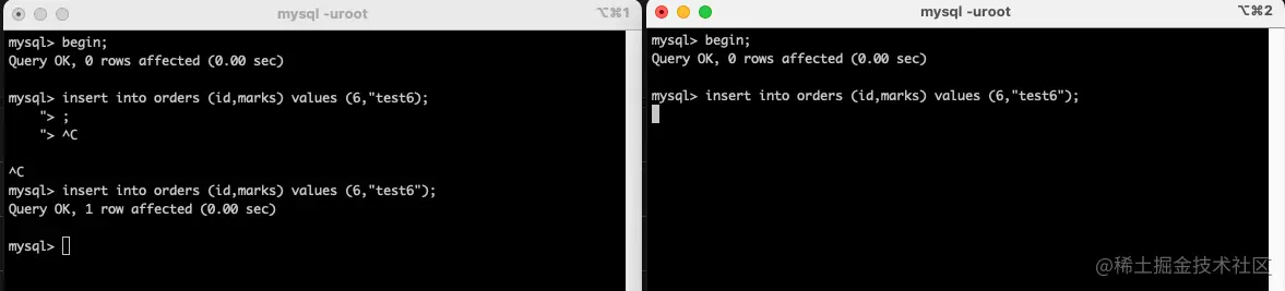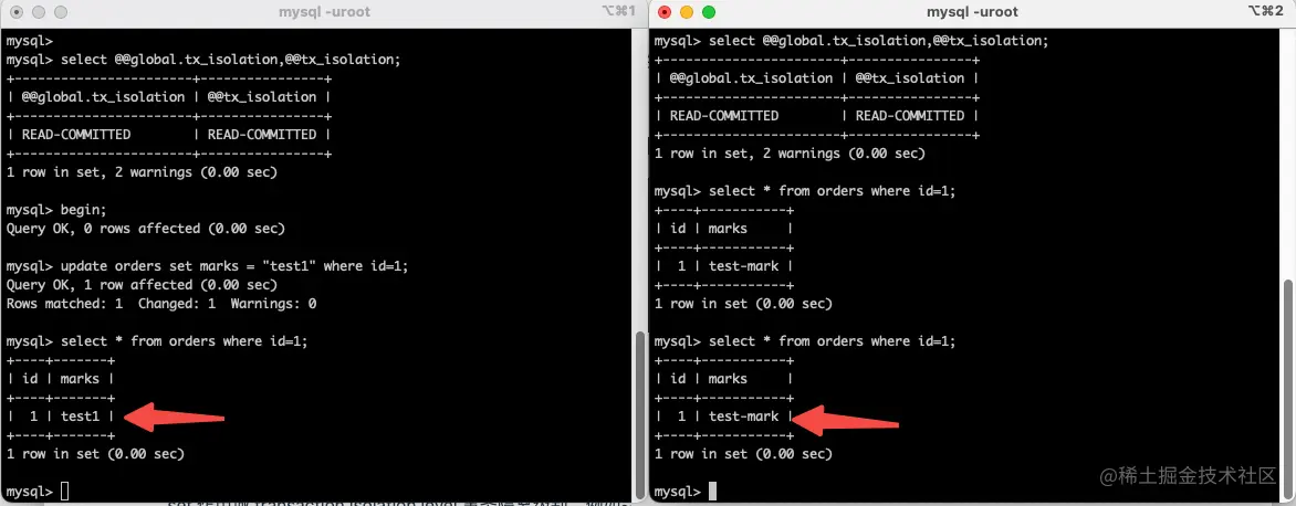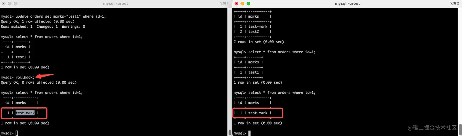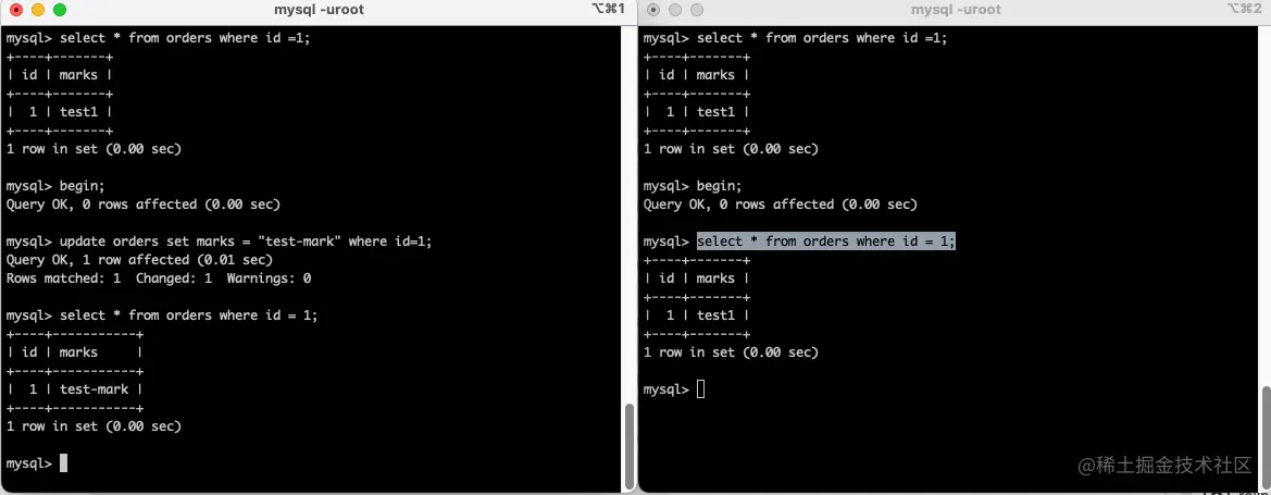 - 3、开启两个会话窗口,在两个会话窗口内分别开启两个事务,在事务 A 中更新 id =x 的 mark 记录