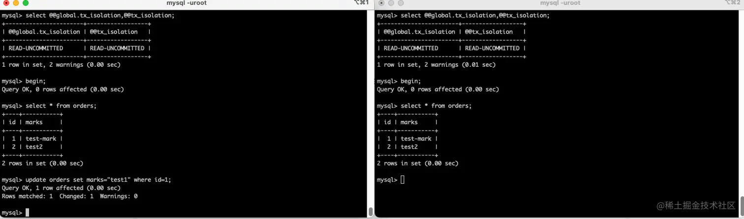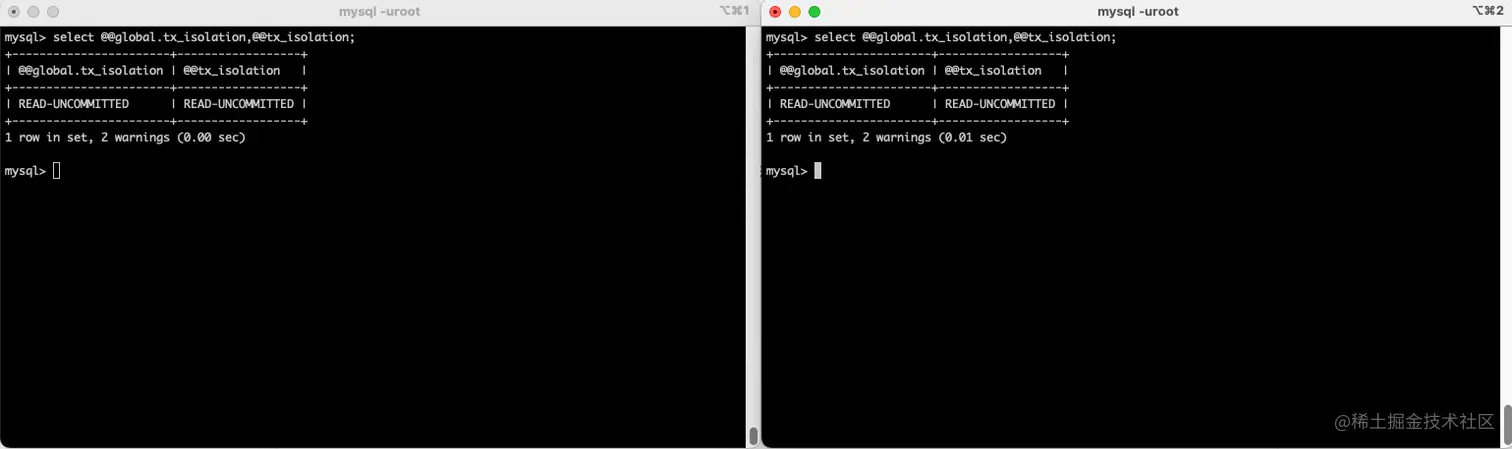 1、将两个会话的事务级别设置成相同的,均为 read uncommitted