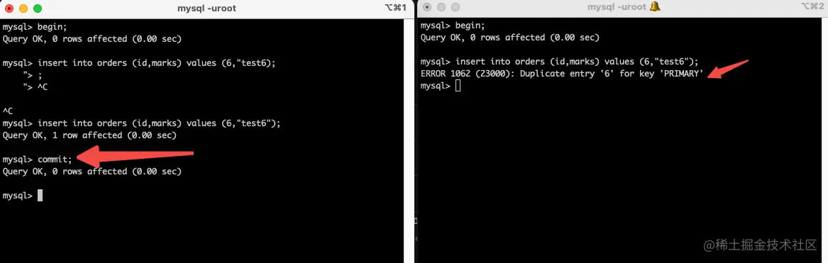在事务 A 和事务 B 中插入同一条数据。这种情况,因为在两个事务中同时写入一条数据,当事务 A 写入 id 为 6 数据,但是没有提交事务的时候,理论上事务 B 又写入 id 为 6 的数据会被阻塞住,那么对于事务 B 来说,它就需要知道事务 A 中有同样的操作;来看案例