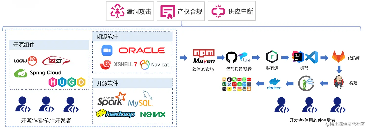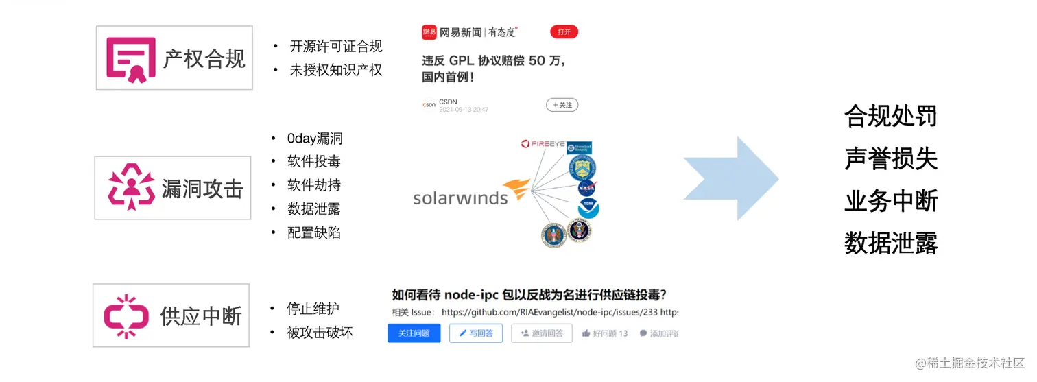 第一个风险是会有一些漏洞的攻击。比如一些开源组件:Log4j、fastjson、Spring Cloud 的一些漏洞。第二个风险是每一个软件诞生都会带有自己的知识产权信息,比如开源的软件的开源许可证的信息、闭源商业软件的知识产权信息,这些信息在每一步供应链的分发、传导过程中会涉及到产权合规的一些风险。第三供应中断,因为供应链整个链条其实是一个持续性的过程,一旦软件的源头被攻击,会导致整个供应中断。