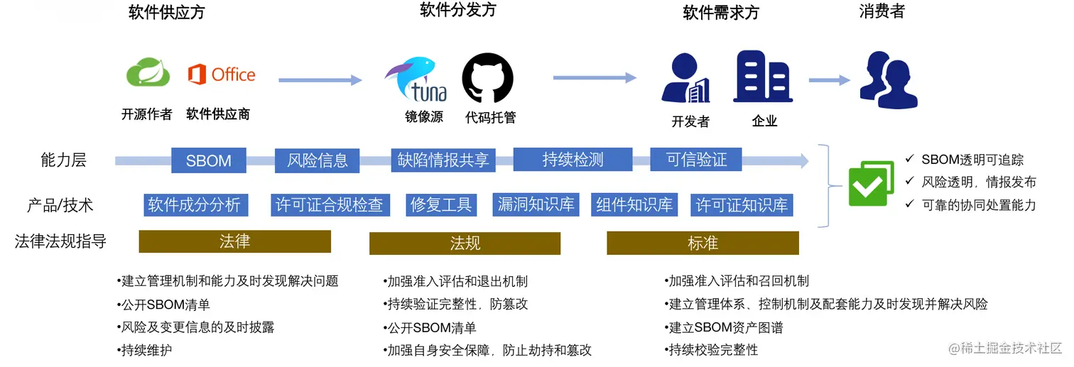 从上述角度来讲,我们去定义整个软件供应链的安全,可以把它理解为一个软件的产品,从原材料包括组件代码,经过分发包括二次的开发,最终形成软件产品的整个过程中的安全保障。在保障的过程中,最终希望软件的消费者能够在使用软件的过程中保障它的数据和使用过程的安全。其最终的目的其实还是为了去提升最终客户的价值。