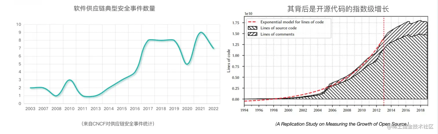 可以看到过去十年软件供应链安全事件的上升量是非常明显的,与这个上升量非常明显相似的是关于背后的开源代码的应用指数据的上升增长,这两者是有非常明显的这么一个关联的。