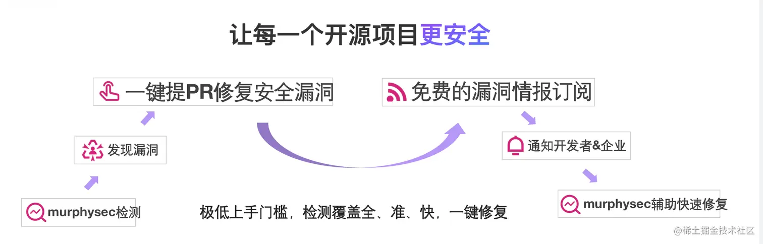 整个过程中流程特别简单,过去为什么开源社区的项目中还会存在这些漏洞的?其实本质上来讲还是它的成本太高,或者说信息不对称导致大家没去做这件事情。我们希望把这件事情做得更简单更易用,通过极低的上手门槛,能够把检测结果做得全准快,帮助开发者一键去修复它。