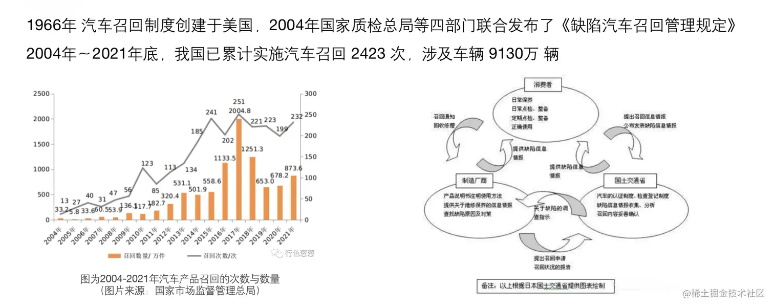 从 1966 年开始,这个美国创建了关于汽车的召回制度。到 2004 年的时候国内国家质检总局包括联合几个部门也发布了关于缺陷汽车的召回管理规定。这个规定出来之后过去 17 年过程中大概实施了 2423 次召回,涉及了 9130 万辆汽车。