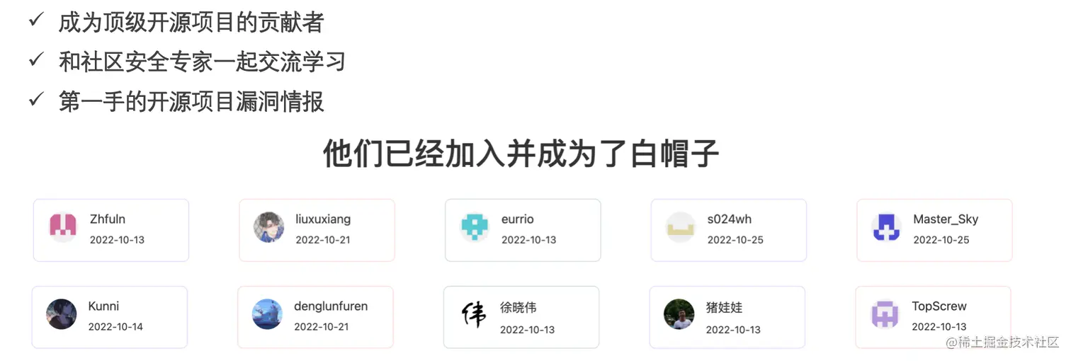社区开发者包括一些白帽子的角色就是帮我们去校准这些信息,可以非常低成本的成为社区中顶级开源项目的贡献者,与社区安全专家共同交流和学习,同时可以拿到最新开源项目的漏洞情报。