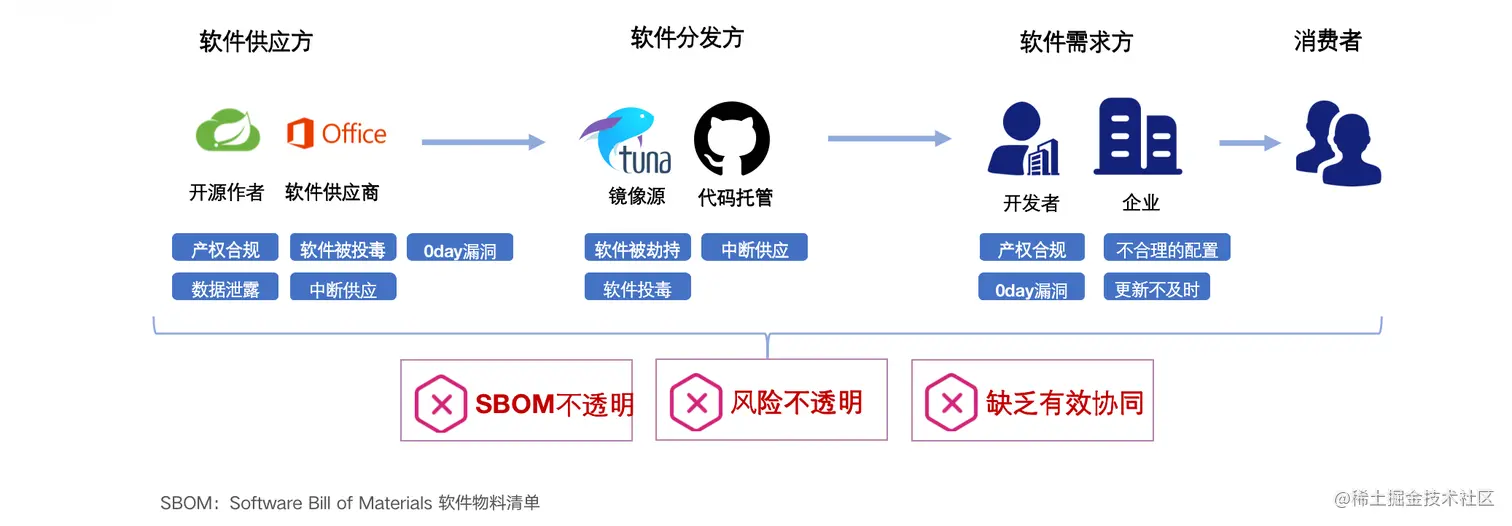 试想一下,大家能否说能够说清楚自己的公司今天到底用了多少开源的软件/公司使用的商用软件,以及这些开源的软件到底用依赖了哪些三方软件?相信很难完整的阐述,为什么会非常难呢?因为从本质上来讲,今天我们所有的开源项目,包括 github 里面的所有的开源项目,包括这些官方语言的开源项目,没有清晰地告诉下游分发方以及使用方,到底引用了哪些三方的组件,也就是 SBOM 软件物料清单是没有的。