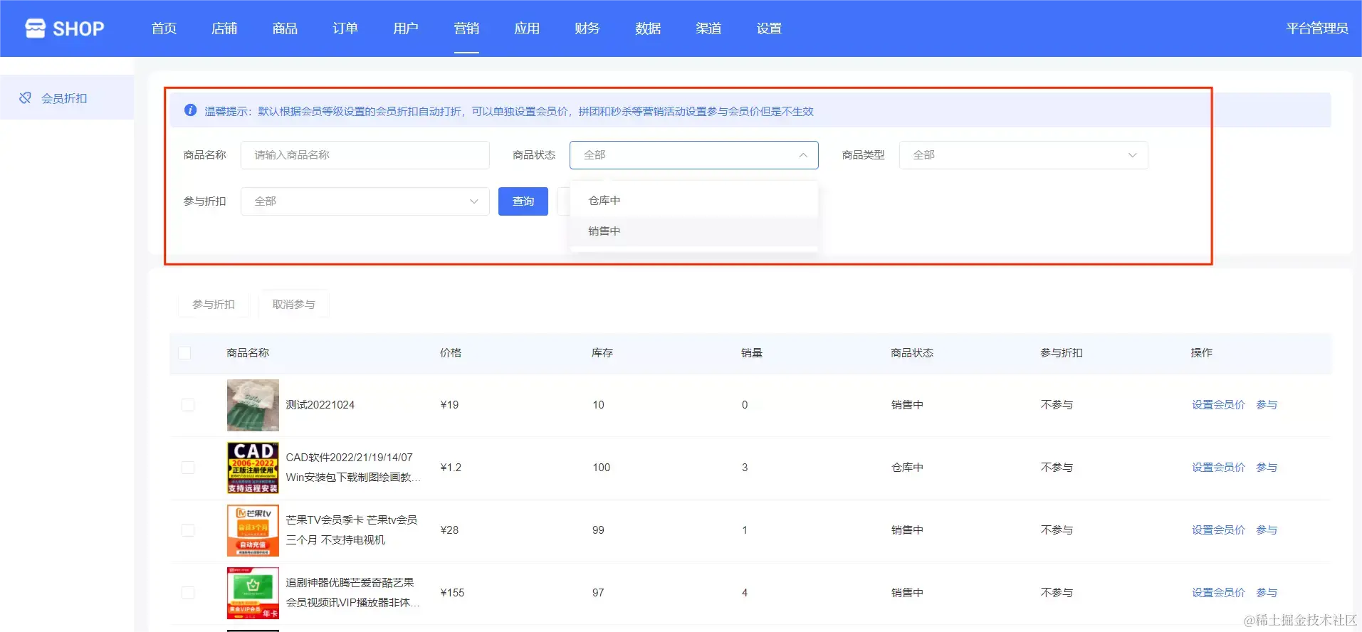 平台管理可以输入商品名称,选择商品状态(仓库中、营销中),选择商品类型(实物商品、虚拟商品),选择是否参与折扣等信息来查询,如下图所示: