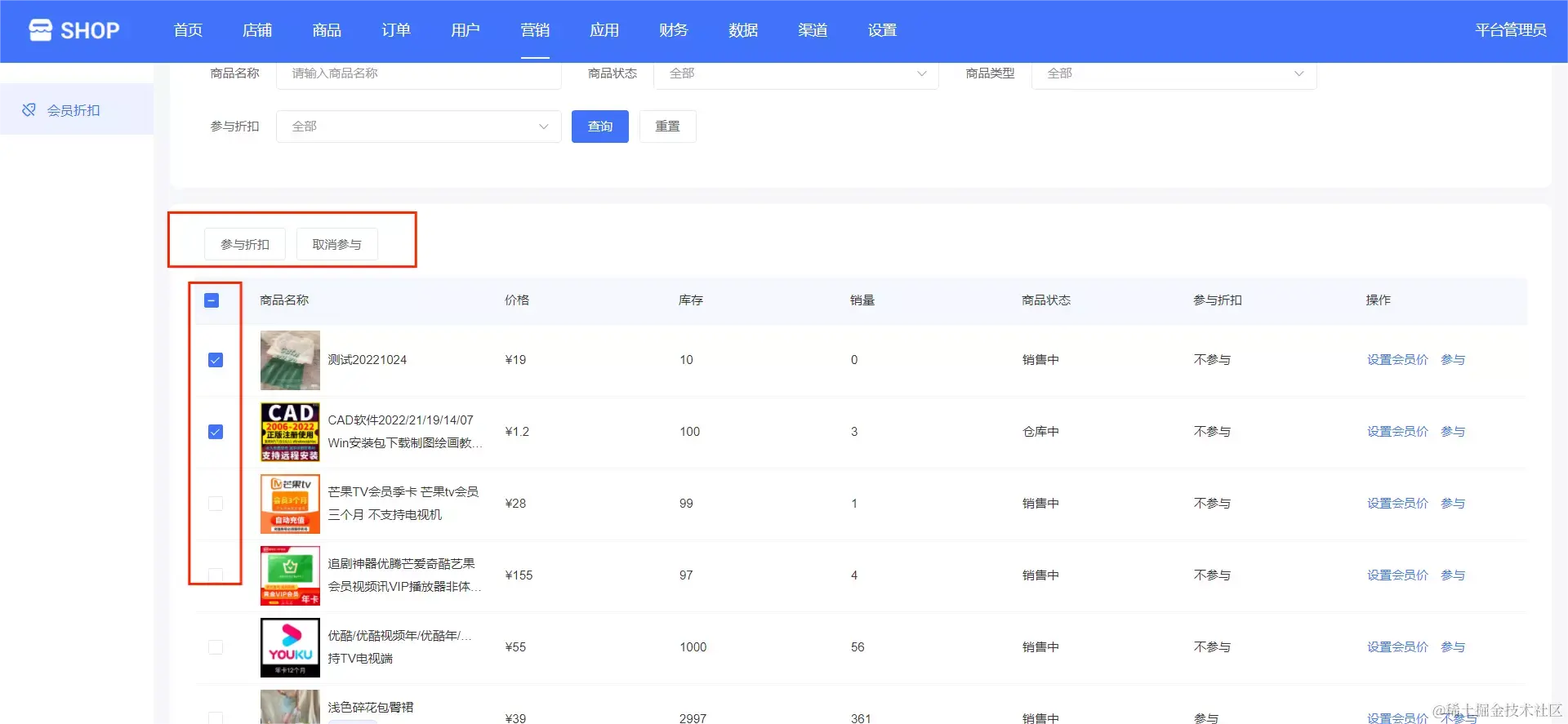 勾选商品可以批量选择是否参与折扣,下面可以看到商品名称、价格、库存、销量、商品状态、参与折扣等信息。如下图所示: