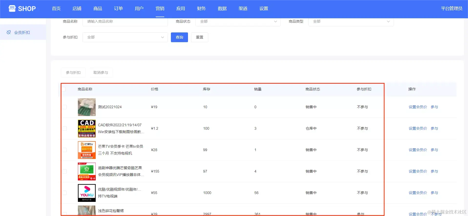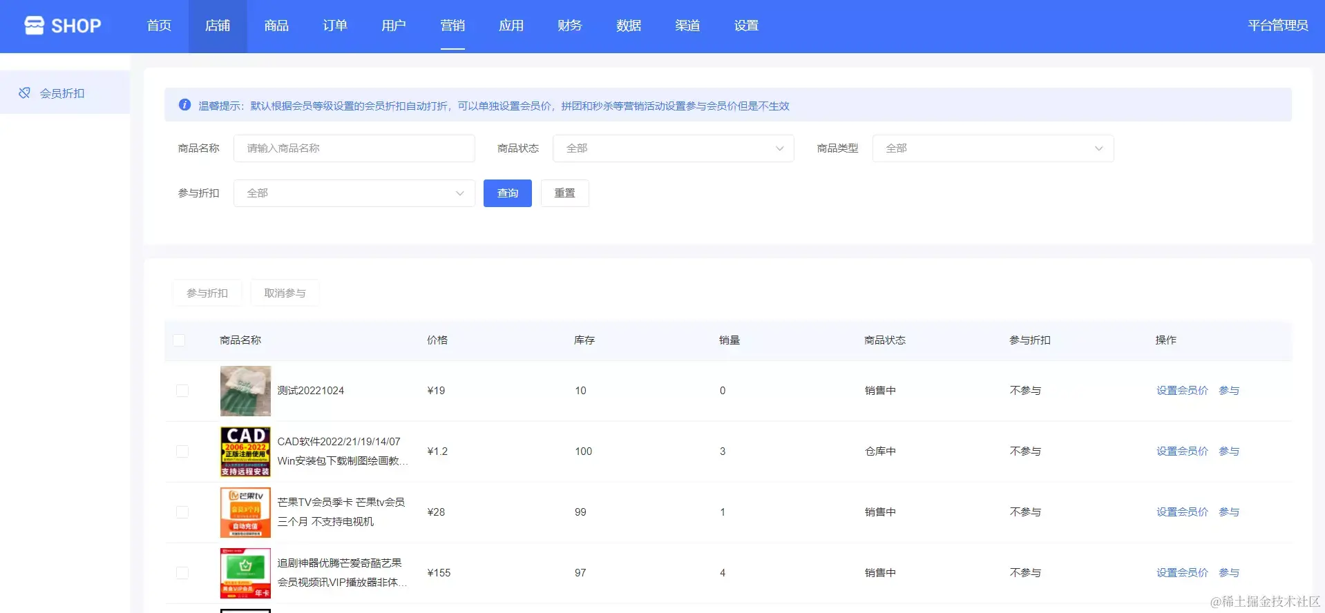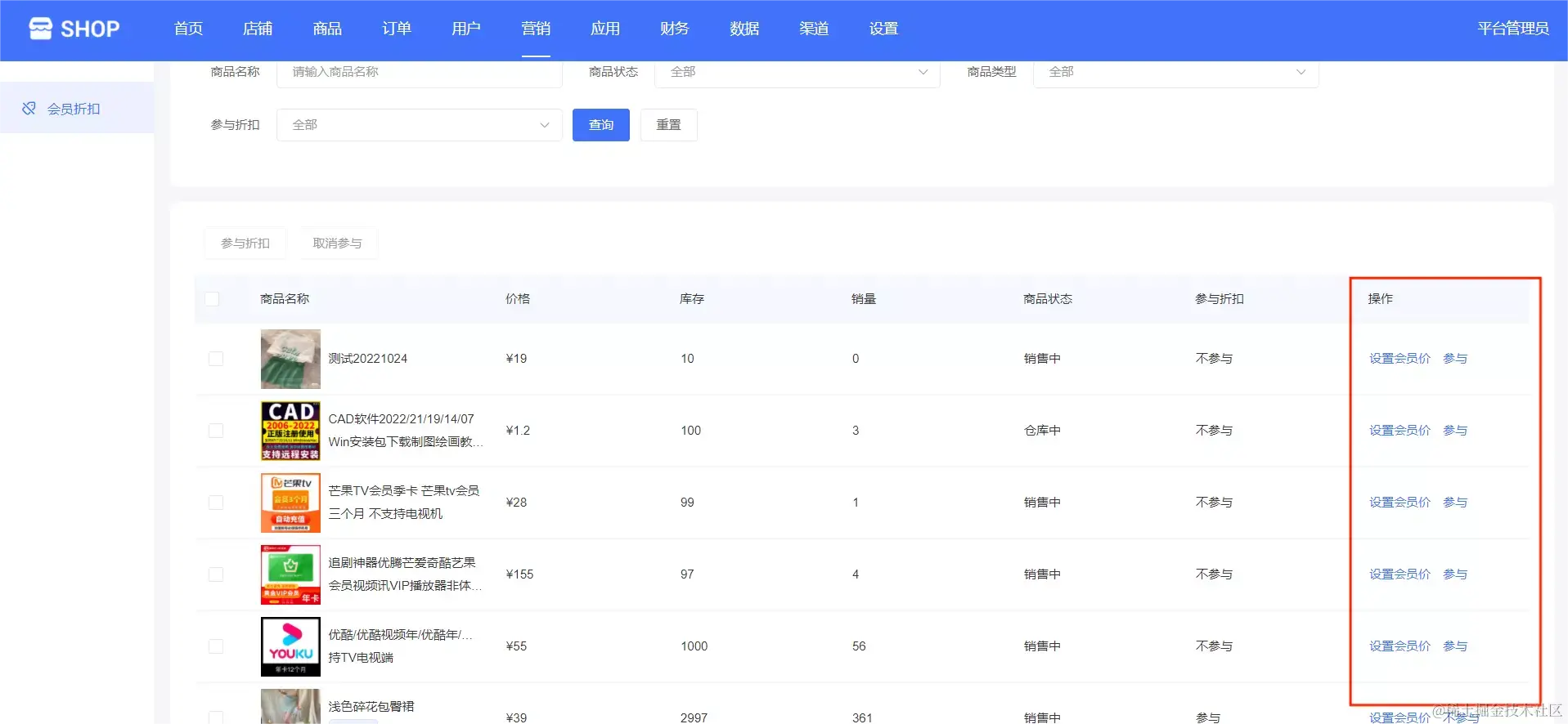 平台管理可以对单独的商品进行设置会员价、参与折扣等操作,如下图所示: