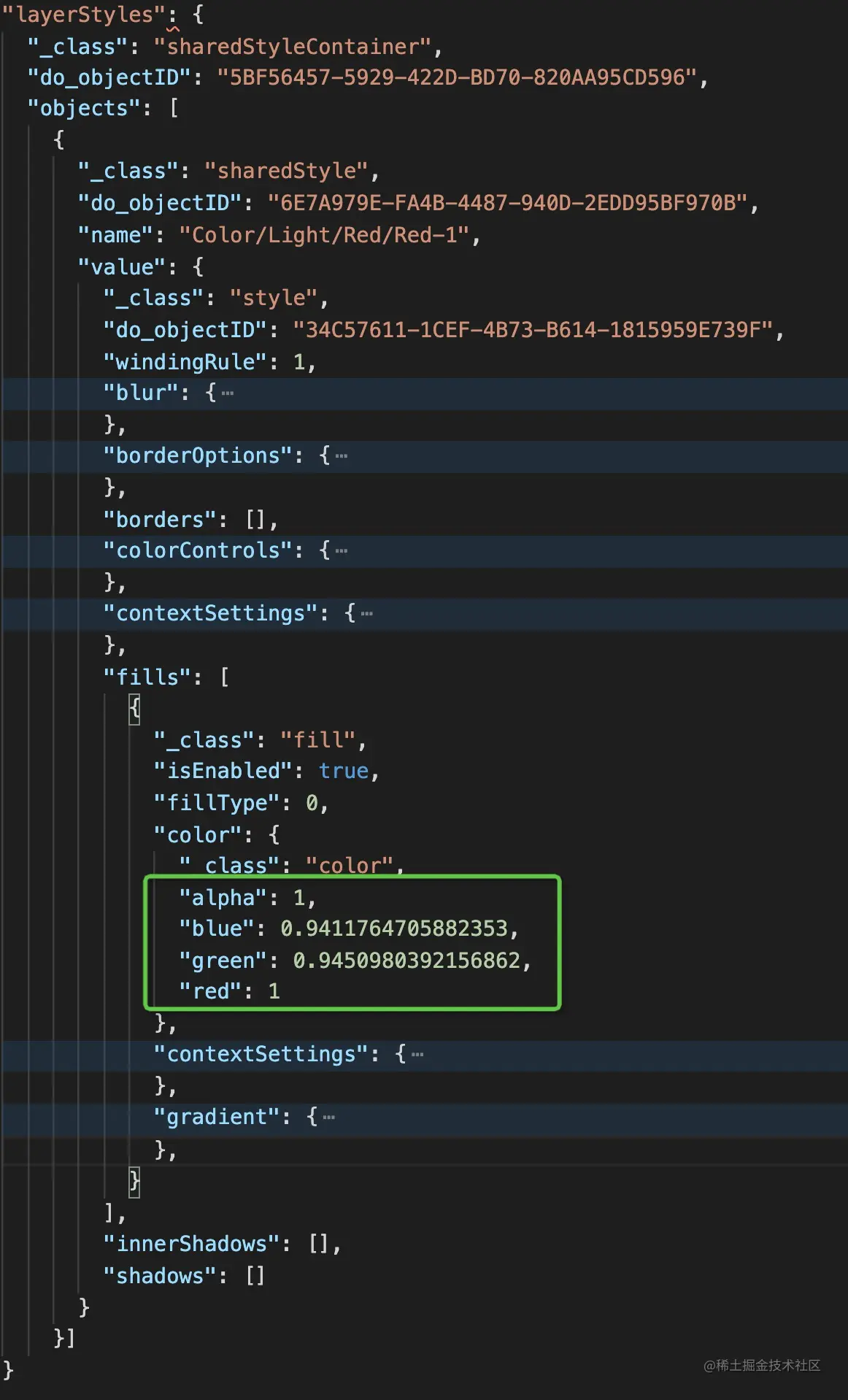 先说说颜色的结构,找到 object-value-fills-color 里的 rgba - red/green/blue/alpha ,具体layerStyles 的 json 截图如下: