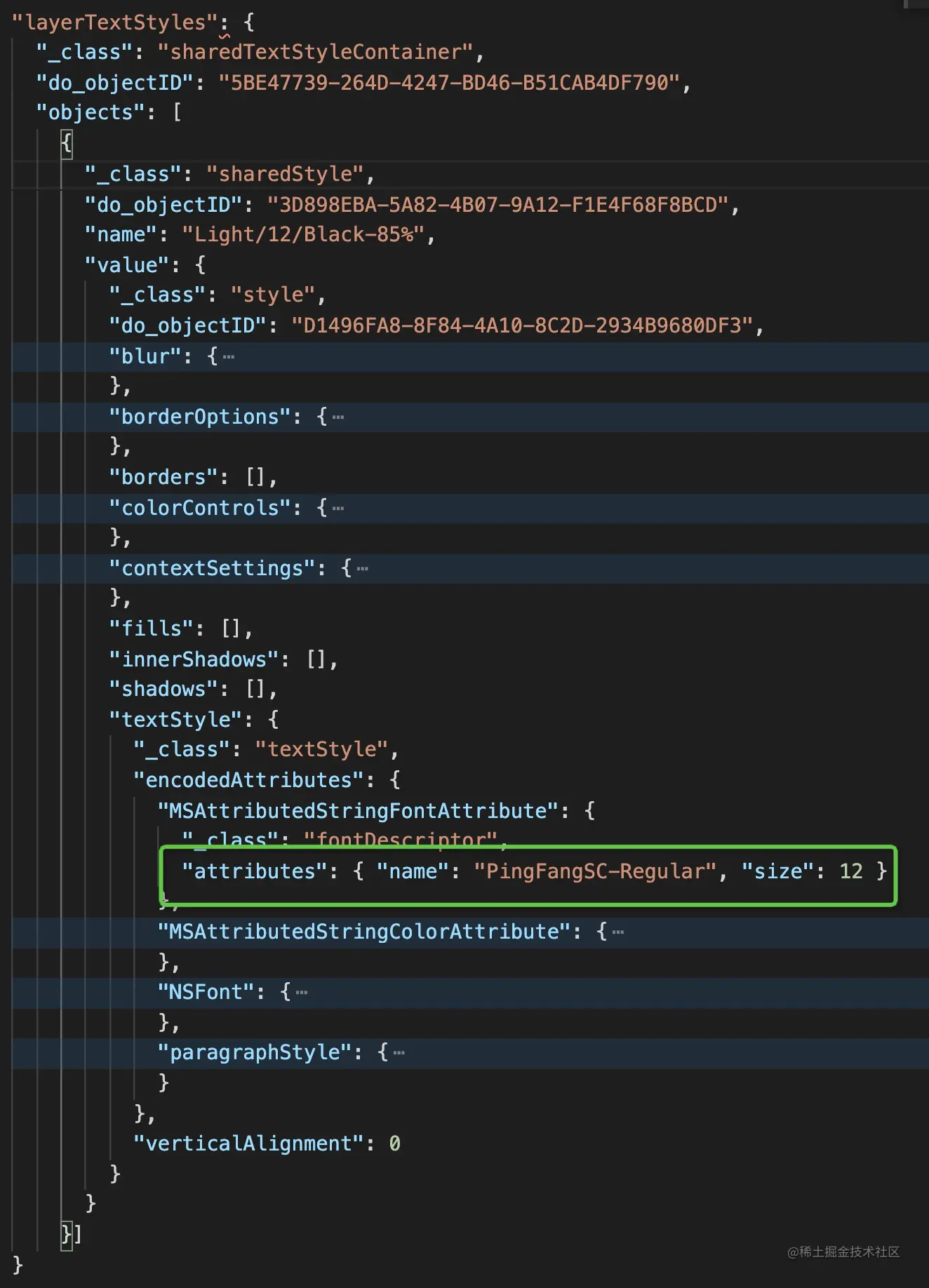 字体的结构,按顺序找到 layerTextStyles - objects - value - textStyle - encodedAttributes
