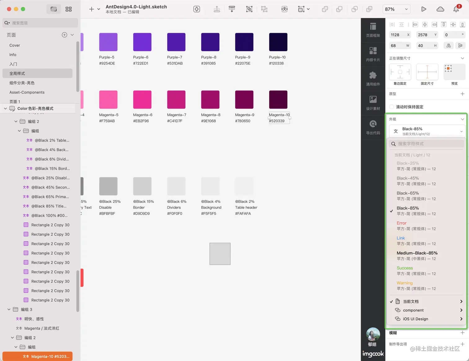 第一步呢,就是从一份 sketch 文件中,提炼一些“规范库”(包括 颜色、字号、字重)的内容。
