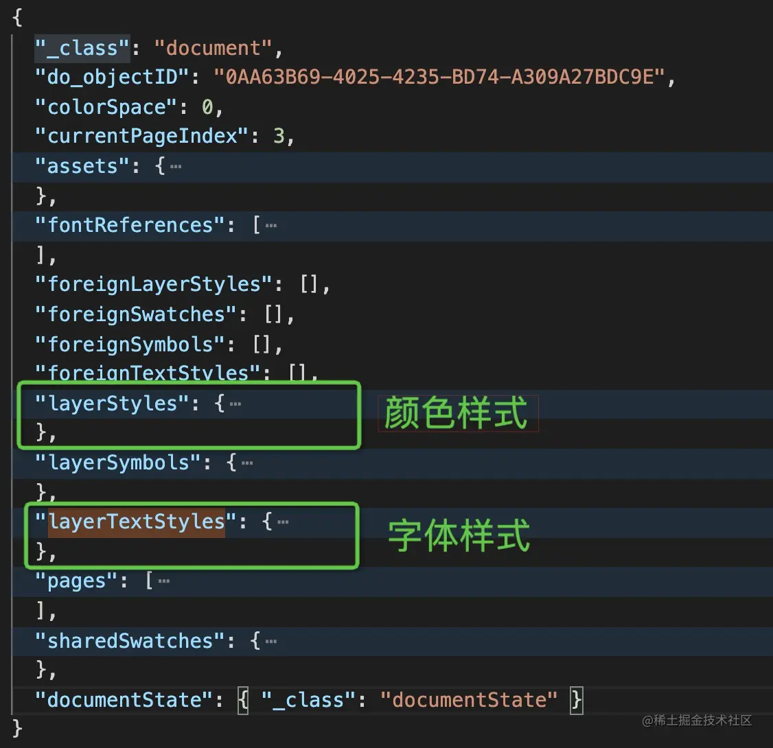打开这个43009行的文件,我懵了,整理下后,发现就是这些结构,然后我们需要的就是 layerStyles(颜色)、layerTextStyles(字体),下面为 document.json 的整个内容结构。