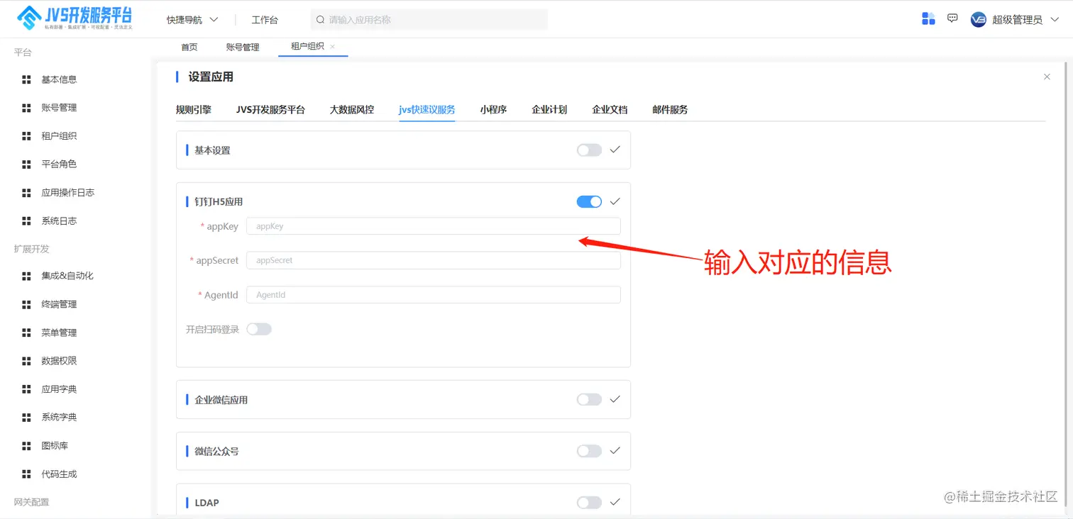 钉钉、企微、公众号、LDAP 输入对应的信息后即可实现登录。