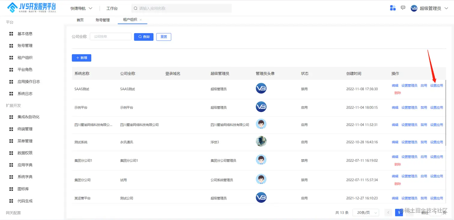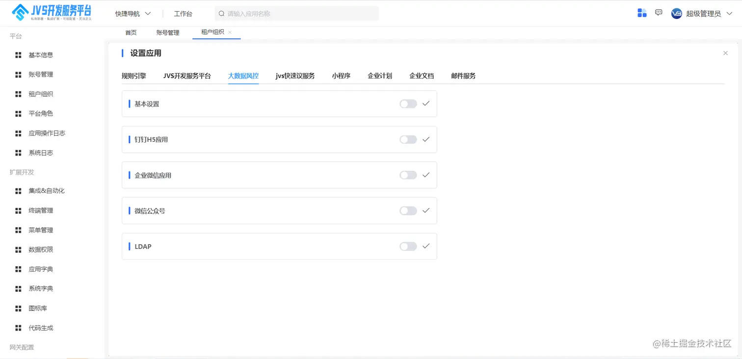 JVS支持多租户与多应用体系,每个租户可以设置不同应用,每个应用可以独立设置登录方式,集合起来:租户-应用-登录 =多:多:多