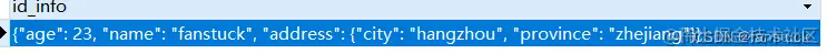 INSERT INTO mytable5 (id_info) VALUES ('{"name":"fanstuck", "age":23, "address":{"province":"zhejiang", "city":"hangzhou"}}');