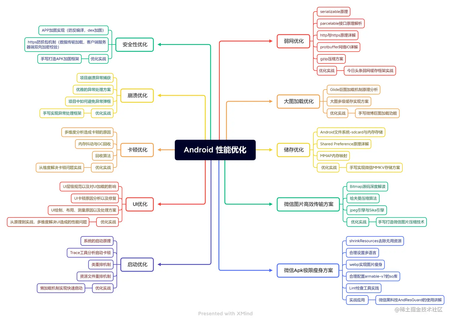 并且通过这张思维导图,融合了这些年的工作经历及对网上的资料查询和整理,最终将其整合成了一份 Android 性能优化的学习手册文档;希望大家通过这个思维导图和学习手册,能够提供一个好的学习方向,查漏补缺,完善自身的不足之处;早日攻克性能优化这一难题