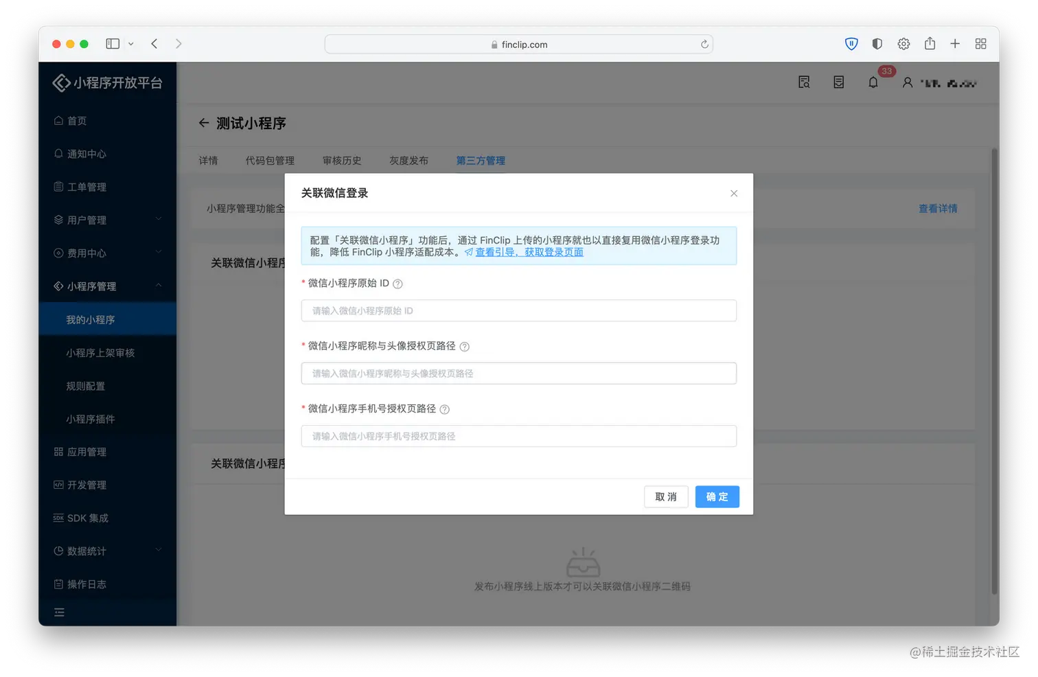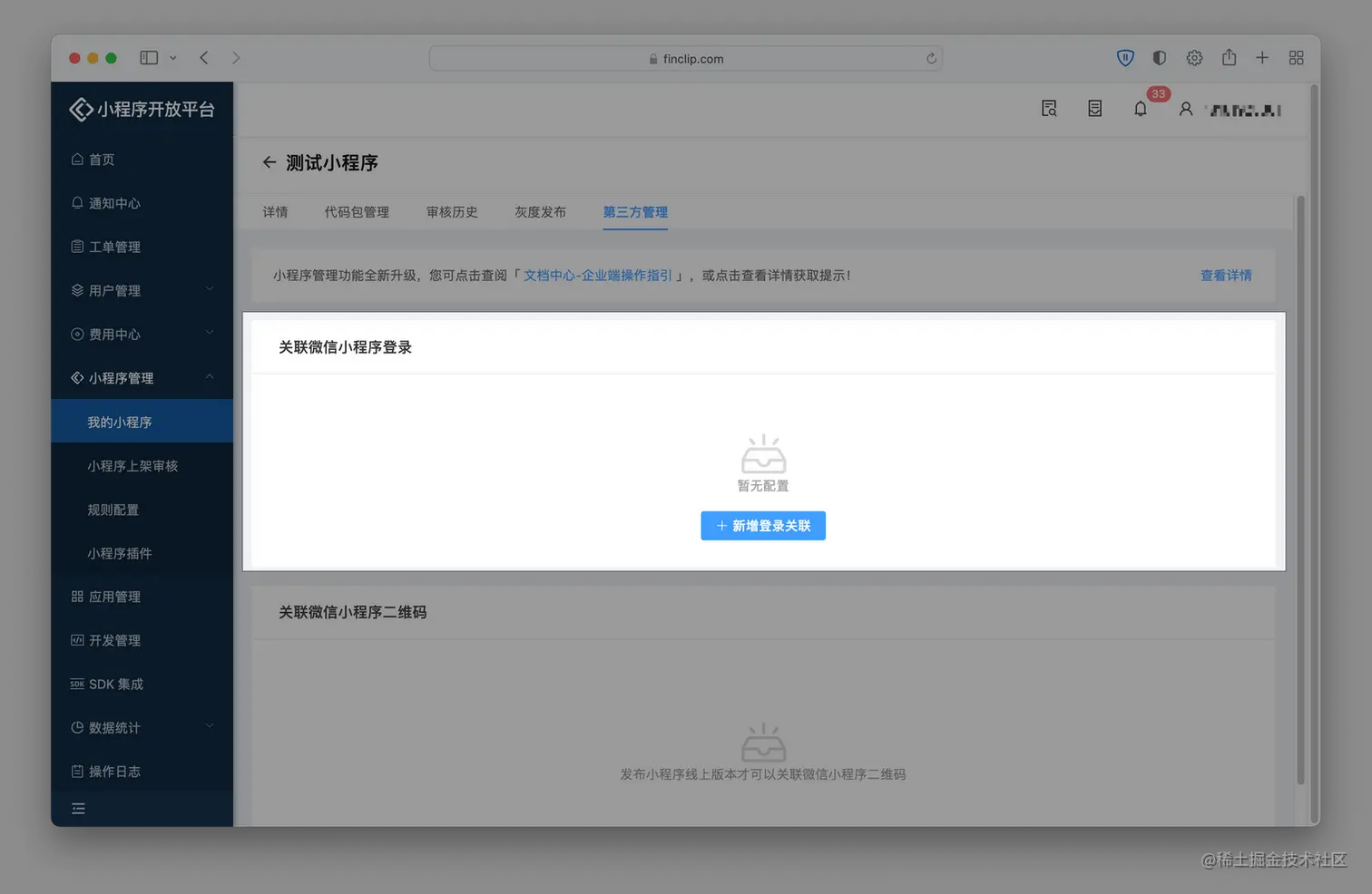 不过在 FinClip 技术团队的技术攻坚后,FinClip 增加了「关联微信小程序登录」的功能,现在开发者可以在登录 FinClip 后,分别点击「小程序管理-我的小程序-小程序详情-第三方管理」,在其中会见到功能卡片。