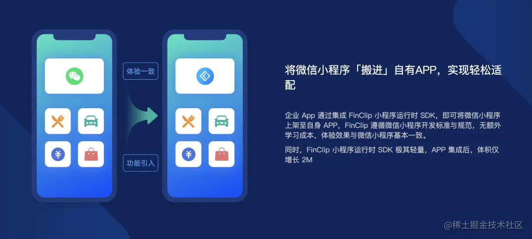 简单来说 FinClip 就是可以让小程序脱离微信环境最快运行在自有App中 ,未来每个企业都能够打造属于自己的小程序专属生态,不必再寄居在互联网巨头的App中。