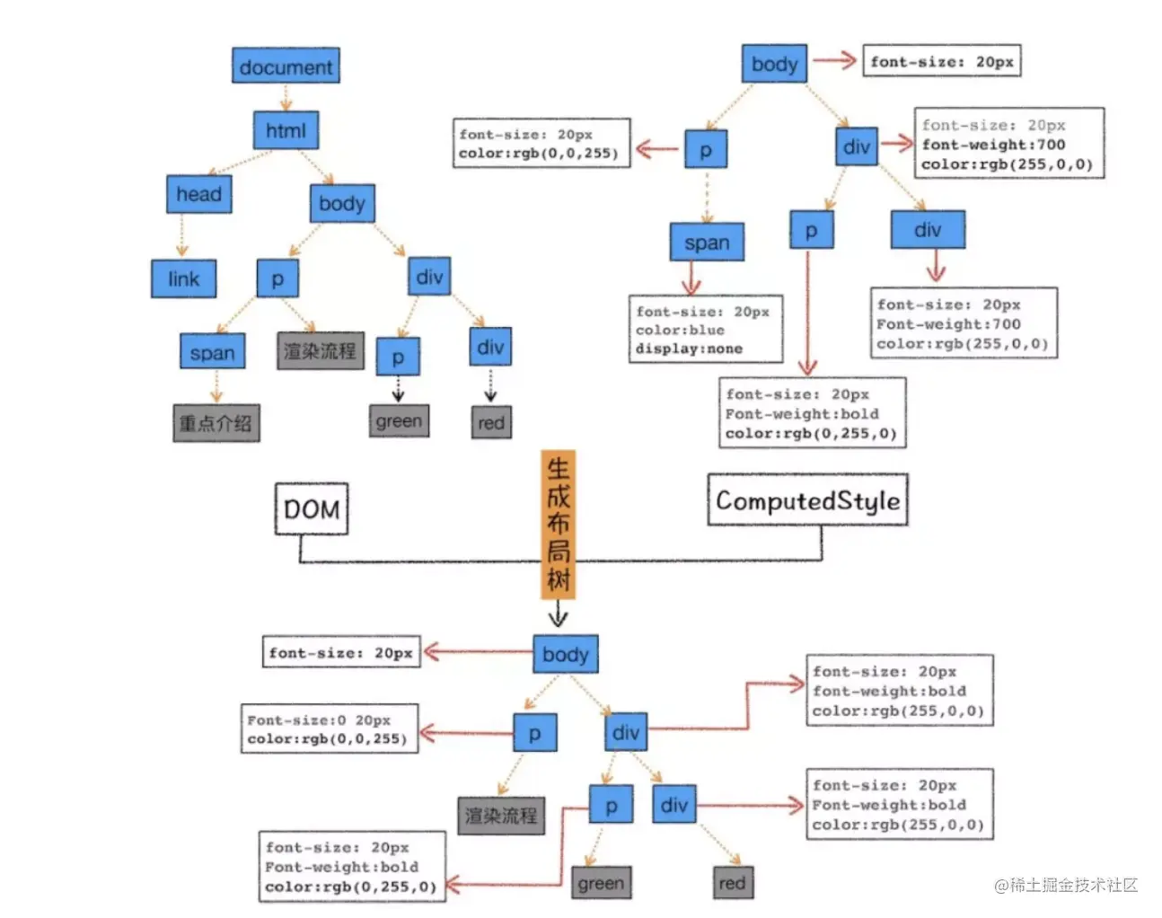 styleSheets,计算出DOM节点的样式。 - 创建布局树,并计算元素的布局信息。